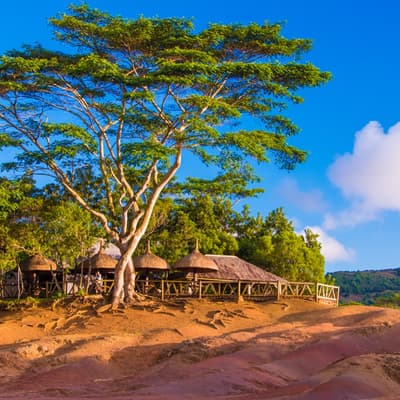 Chamarel fait partie des villages et destinations incontournables du sud-ouest de Maurice, perché à 283 mètres d'altitude. C'est le site naturel emblématique de l'île avec la Terre des Sept Couleurs (phénomène géologique unique de dunes multicolores : rouge, brun, violet, vert, bleu, violet, jaune) et la Cascade de Chamarel haute de 100 mètres, la plus haute cascade accessible de Maurice. Le village abrite aussi la Distillerie de Rhum de Chamarel réputée pour son rhum agricole artisanal, avec visites guidées et dégustation. Le Point de Vue de Chamarel offre un panorama exceptionnel sur la côte ouest et Le Morne. L'atmosphère est rurale et authentique avec l'église Saint-Anne et des artisans locaux. Une demi-journée minimum est recommandée avec visite matinale pour la lumière optimale.