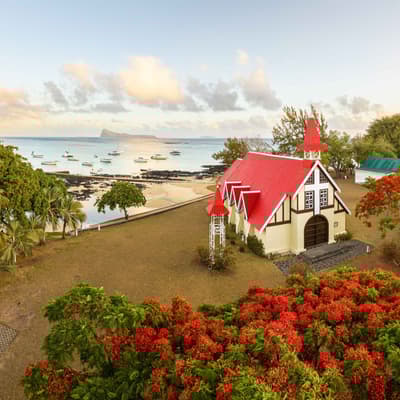Notre-Dame Auxiliatrice se dresse face à l'îlot du Coin de Mire dans le nord de l'île Maurice. Son toit rouge vif contraste avec le bleu du lagon, créant l'une des cartes postales les plus photographiées de l'île. Cette petite église construite en 1938 mesure 15 mètres de long et peut accueillir 80 fidèles.