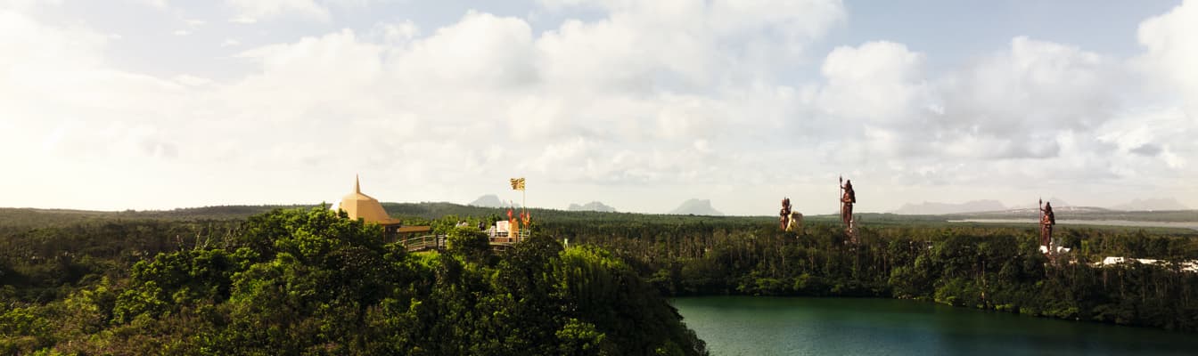 Le point de vue le plus spectaculaire se trouve derrière la statue de Shiva. Vous pouvez y admirer l'ensemble du site : le lac, les temples colorés et la végétation tropicale environnante. Par temps clair, la vue s'étend jusqu'aux côtes de l'île Maurice.