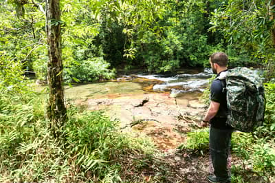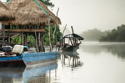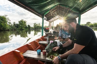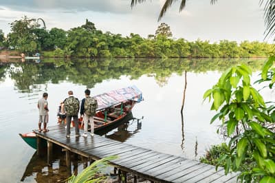 C’est parti pour une aventure de deux jours à travers la jungle ! Vous vous réveillez avant le lever du soleil pour prendre un bateau à longue queue motorisé, sur lequel vous attend un petit-déjeuner local. Profitez du lever du soleil à bord, tout en observant la jungle se réveiller doucement. Pour la dernière portion de la balade, vous embarquez sur un petit bateau à rames pour profiter silencieusement du décor et observer avec attention les oiseaux et autres animaux sauvages sur les rives (1h30 de navigation sur la matinée). Une fois arrivés au point de départ de la randonnée, vous débutez votre marche dans la jungle sauvage. Trois heures plus tard, vous atteignez un cours d’eau tranquille au milieu de la forêt. C’est l’heure de la pause déjeuner, soigneusement préparée par votre guide local et votre cuisinier. L’occasion de se reposer et de se rafraichir au bord de la rivière. Vous reprenez ensuite votre randonnée en direction du camp, où vous installez votre hamac sous une hutte couverte. Le soir, donnez un coup de main pour préparer le dîner avant de vous laisser bercer par les doux bruits de la nature alentour ! Nuit au camp dans un hamac (dans la jungle).