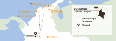 Trajet : transfert en véhicule privatisé, environ 3h30 (3h San Rafael - Medellin, 30min Santa Marta - Minca), vol d'environ 1h15 (Medellin - Santa Marta)