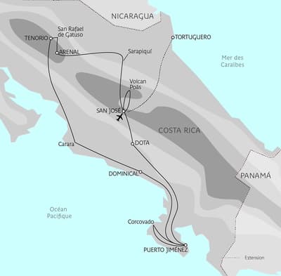 (ou hôtels de catégorie similaire) SAN JOSÉ Autentico Torremolinos ou Sleep Inn *** ARENAL Arenal Country Inn ou Arenal Montechiari ou Eco Arenal ou Lavas Tacotal ou Arenal Paraiso *** TENORIO Celeste Mountain Lodge ou Finca l’Étoile Celeste *** DOMINICAL Hôtel Marino Ballena ou Villas Rio Mar *** PUERTO JIMÉNEZ Agua Dulce Resort *** DOTA Suria ou Paraiso del Quetzal ***
