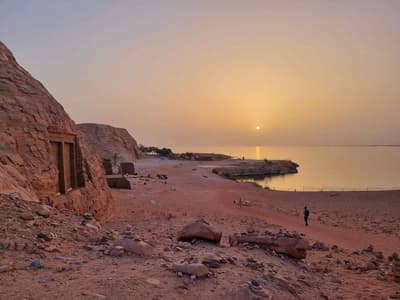 Après une dernière matinée dédiée au projet, il est déjà temps de quitter votre famille d’accueil pour entamer la traversée du désert de Nubie jusqu’à Abou Simbel (environ 4 heures de trajet). Installez-vous dans un charmant lodge à l’ambiance familiale et profitez d’une paisible croisière sur le lac Nasser tandis que le soleil décline. C’est en bateau que vous rejoigniez pour la première fois les temples majestueux de Ramsès II et de sa bien-aimée, la reine Nefertari. Postées à chaque entrée, leurs imposantes statues s’offrent à vous seuls dans la quiétude du crépuscule. Prenez place dans les gradins pour assister au spectacle Son et Lumière retraçant la formidable épopée d’un des plus grands souverains du Nouvel Empire. Dîner et nuit en lodge rural.
