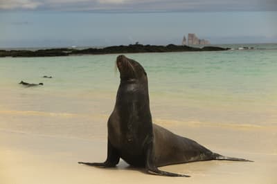 - L’île de San Cristobal abritant la plus grande colonie d’otaries des Galapagos et au large, le célèbre rocher du Lion Endormi.