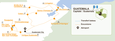 Prolongez votre aventure au Guatemala pour découvrir le nord du pays en prenant un vol au départ de Guatemala City pour Flores. Petite ville pittoresque située sur une île au lac Petén Itzá célèbre pour sa beauté naturelle et son ambiance charmante, Flores est également un excellent point de départ pour explorer plusieurs sites archéologiques fascinants de la région tels que Tikal, Yaxhá, Nakúm, Ceibal, Uaxactún… Le lac Petén Itzá offre de nombreuses possibilités d’activités nautiques (kayak, excursion en bateau, baignade). Enfin, si vous avez le temps, explorez des endroits comme Sayaxché, connu pour ses forêts tropicales et ses rivières, ainsi que les phénomènes naturels comme la bioluminescence.