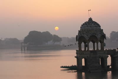 Après le petit-déjeuner, vous prenez la route de Jaisalmer située au cœur du désert du Thar (6h de route, déjeuner en chemin). A l’horizon, dans les mêmes tons ocres que le désert qui l’entoure, s’élève la surprenante forteresse de Jaisalmer. Vous partez pour une excursion dans le désert du Thar aux côtés d'un chamelier qui vous guide dans les dunes jusqu’à ce que le soleil couchant laisse place aux étoiles. Dégustez un dîner autour d’un feu de camp. Nuit à la belle étoile, avec néanmoins la possibilité de dormir chez l’habitant si les températures descendent trop.