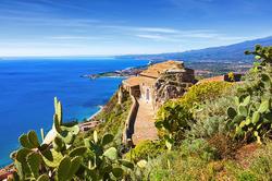 Transfert en bus privé (trajet 1h env.) à Castelmola au sanctuaire de la Madonna della Rocca. Niché sur le Mont Tauro, la vue sur la ville en contrebas et la mer Ionienne est saisissante. Descente à pied sur Taormina. Flânerie dans le centre de la charmante Taormina et sur le Corso Umberto I où se trouvent le théâtre gréco-romain et le palais Corvaja que vous pourrez admirer de l'extérieur.