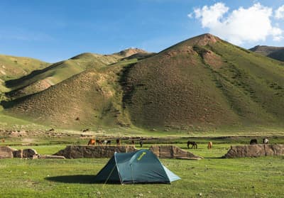 Après avoir fait vos adieux à la famille, vous reprenez la route à travers la steppe d’Ak Saï (6h de trajet). Vous longez la frontière chinoise avant d’arriver dans la vallée d’Ichke, après plusieurs heures de piste poussiéreuse. Vous entamez une randonnée vers le caravansérail de Tash Rabat (3h de marche). Après avoir franchi un col à 3 430m d’altitude, vous descendez à pied vers le caravansérail, comme les caravanes d’antan. Ce caravansérail, le plus haut du monde à 3 200 m d’altitude, était un véritable havre de paix pour les caravanes qui passaient sur cet itinéraire des routes de la soie. Après cette visite, vous vous installez au camp de yourtes de Nazira, où vous retrouvez un peu de confort ! Un grand luxe à la kirghize. Vous dînez dans la confortable cuisine du camp. Nuit sous yourte.