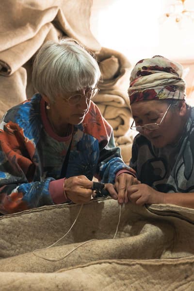 Profitez d’une matinée libre à Tash Rabat à la découverte de cette vallée montagneuse. Vous reprenez ensuite les routes de la soie en direction de Kotchkor (4h de trajet). Une fois arrivés, vous passez à la coopérative de feutre des femmes de la ville. Elles vous montreront comment elles produisent les shyrdaks, tapis traditionnels, dont les secrets de fabrication et les motifs sont inscrits au Patrimoine Mondial de l’UNESCO. Vous vous installez chez la famille de Sabyrbek et Marya, avec qui vous partagez un délicieux dîner. Nuit en maison d’hôtes.