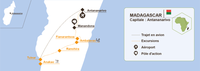 Trajet : transfert en bateau collectif, environ 1h / transfert en véhicule privé, environ 20 minutes / 1h15 à 2h30 de vol. Les vols intérieurs étant peu fréquents, il est possible qu’aucune disponibilité ne soit assurée au moment de la réservation. Le cas échéant, une alternative par voie terrestre sera proposée, avec un itinéraire passant par Antsirabe (environ 10h de route le premier jour et 6h le lendemain)