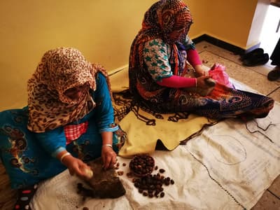 Vous visitez le grenier collectif d’Ifri (45 min de trajet). En partie troglodyte, il constitue un véritable chef-d’œuvre de l’architecture rurale ! Vous êtes ensuite conduits au village d’Imzilen (2 heures de trajet) pour partager un déjeuner avec la coopérative féminine locale qui vous accueille. Dans l’après-midi, des artisans vous font découvrir le processus de fabrication de l’incontournable huile d’argan. Profitez d’une balade dans le village et les champs d’argan au coucher de soleil ! Dîner et nuit chez l’habitant.