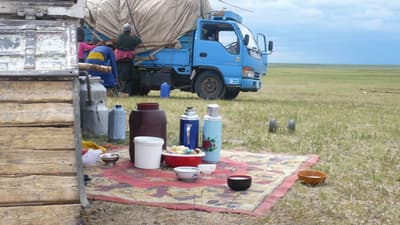 Le matin, c’est au lever du soleil que vous découvrez vos premières images de Mongolie. L’immensité des steppes, ponctuées de yourtes et de troupeaux broutant en liberté. A votre arrivée à la station d’Erdenet, vous serez accueillis par la famille de Deeye, dont l’accueil et l’hospitalité vous mettront vite à l’aise. Dans la convivialité de la yourte, vous dégustez votre premier Suutei Tsai, il s’agit d’un thé au lait salé, et l’Aaruul, le fromage mongol sec. Vous profitez de la journée pour observer librement vos premières scènes de la vie quotidienne sous la yourte et au campement. En fin de journée, vous participez à la confection de votre dîner : des raviolis mongols ou buuz. Tout le monde peut mettre la main à la pâte, un vrai moment de partage culturel. Nuit en yourte chez l’habitant.