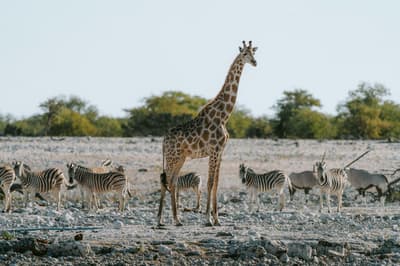 Après un petit déjeuner à la guesthouse, vous partez avec votre véhicule vers le nord (5 heures de trajet, 430km). Déjeuner libre en route avant d’arriver au célèbre Parc National d’Etosha. Vous prenez le temps de vous installer à votre hôtel puis partez pour votre premier safari avec votre véhicule dans cet espace préservé qui s’étend sur plus de 22 000 km². Ouvrez les yeux, 114 espèces de mammifères et 340 variétés d’oiseaux peuplent les lieux. Vous croiserez surement les zèbres de Burchell, aux pattes toutes blanches. Les gnous bleus sont souvent à leurs côtés. Les oryx gazelle ne seront probablement pas loin. Dans les flaques d’eau se détachent par leur grâce les fameux flamants roses et les cigognes. Les éléphants d’Afrique s’abreuvent et se lavent, à l’aide de leur trompe musclée. Dans la prairie entourant les oasis, les impressionnantes girafes grignotent la cime des arbres et les Springboks, sont aux aguets, prêtes à faire des bonds de 4 mètres si un prédateur les prend en chasse. Justement, les lions et les léopards surveillent tranquillement le spectacle. Dîner libre et nuit au camping du lodge sous tente de toit.
