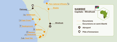 - Les activités non mentionnées au programme avec les entrées dans les parcs (Etosha à 150 NAD par personne, à régler sur place) et sur les sites culturels et les suggestions d'activité