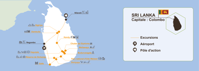 Les régions visitées bénéficient d’un ensoleillement généreux sur l’ensemble de l’année. La période idéale pour visiter la côte Ouest et le Sud corres- pond à notre Automne - Hiver. À cette même période, la mé- téo est moins clémente en ré- gion montagneuse (saison des pluies). Prévoir des nuits plus fraiches dans les montagnes (Haputale).