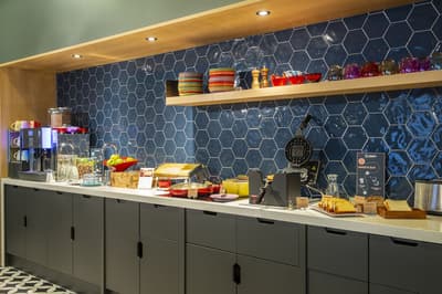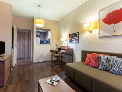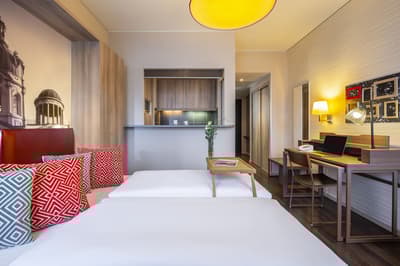Vous cherchez un bon plan pour un séjour à votre main ? Venez faire un tour du côté de l’Aparthotel Adagio Berlin ! Comme tous les établissements de la chaîne, il propose des studios et des appartements super équipés, combinés à de vrais services hôteliers. Côté emplacement, vous êtes dans le très chic quartier de Charlottenburg, à 200 mètres de la mythique avenue Kurfürtstendamm. L’hôtel est un peu en dehors du centre-ville mais si vous aimer marcher, vous allez vous régaler. De toute façon, le métro est juste à côté ! L’accueil est à l’image du lieu : très chaleureux. Côté activités, pas trop de risque d’être cantonné dans votre appartement ! Les parties communes du rez-de-chaussée sont hyper conviviales et bien agencées. Meubles design, couleurs acidulées et déco un brin décalée mettent en valeur des espaces cosy. Vous pouvez buller dans les canapés, pianoter sur l’ordinateur du business corner, siroter votre café sur la table du petit déjeuner, faire une partie de baby-foot ou vous plonger dans la presse du jour. Un plan de la ville et des guides sont à disposition pour préparer vos excursions. Les appartements sont parfaits à deux ou en famille. Zen et lumineux, avec un joli mélange de rouge, de bois clair et de sublimes photos de Berlin en noir & blanc. La cuisine équipée vous donne des idées ? Ça tombe bien. Le supermarché est juste à côté ! Pour la salle de fitness, aucune d’excuse ! Elle est ouverte 24h sur 24.