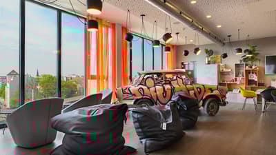 Un hôtel sur le toit d’un parking ! Un peu dingue, non ? Au-delà de l’innovation, le concept répond aussi à une réalité. Conjuguer développement hôtelier écolo et urbanisme local hyper densifié. Les structures durables du Niu Hide ont été fabriquées en Bavière, puis hissées au dernier étage pour y être assemblées. Premier hôtel modulaire de la ville, le spot est situé à l’Est avec tous les transports à ses pieds. Sa construction n’est pas la seule originalité. Vous voulez un city-break arty, surprenant et coloré ? Vous êtes au bon endroit ! Les portes de l’ascenseur s’ouvrent sur un lobby décloisonné au look furieusement berlinois et décalé. De la réception au bar, l’espace mélange vestiges de l’ex-RDA, street art bariolé, vintage chic et design branché. Côté nostalgie, difficile de faire mieux que la vieille Trabant peinturlurée garée dans le hall, près des tables du petit déjeuner. Partout dans l’établissement, les tags flamboyants des street artists allemands donnent une ambiance urbaine prononcée. Plafonds indus, accessoires rétro et luminaires design complètent le décor. Que vous soyez dans l’espace lounge, dans le confort de votre chambre ou attablé dans la salle à manger, l’atmosphère est à l’image de la ville : relax, hip et bigarrée. Côté détente, vous pouvez miser sur le combo baby-foot, jeux de société et cocktails signature au bar. Envie de cartonner sur Insta ? Installez-vous au volant de la Trabant !