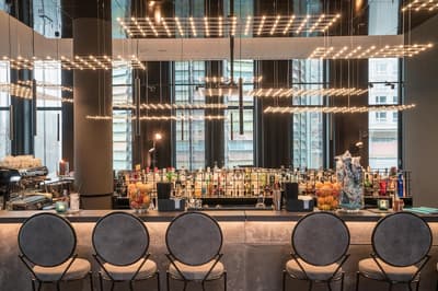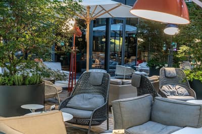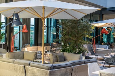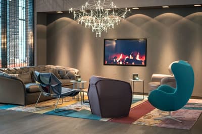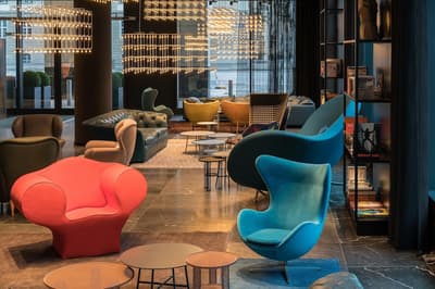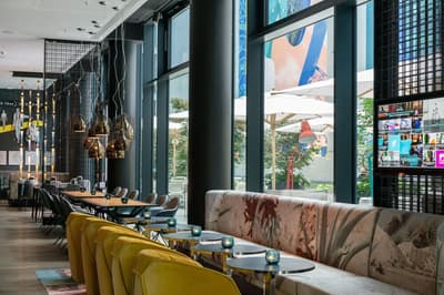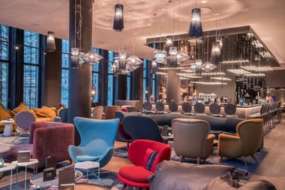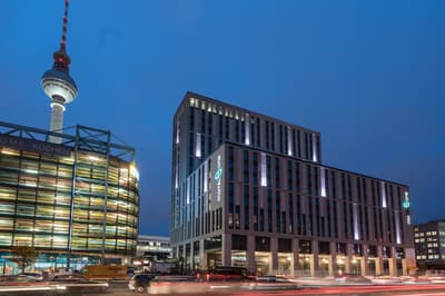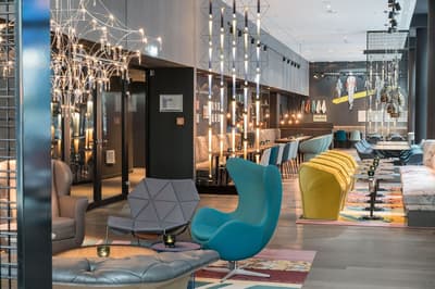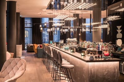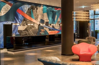 Avec ses 18 étages, le Motel One Alexanderplatz est loin de la petite adresse intimiste. Mais si vous cherchez un hôtel design et coloré, avec un super emplacement et un look très berlinois, vous êtes au bon endroit ! D’abord, vous êtes à deux pas de la très animée Alexanderplatz. Top pour visiter les principaux monuments à pied. Avec les transports en commun juste à côté. Ensuite, la déco est un mélange résolument funky de mobilier hyper stylé, de street art local et de graffitis. Dès le hall, vous en prenez plein les yeux ! Mi collage, mi pop art, une immense fresque est déployée derrière le front desk. Dans les parties communes hyper spacieuses, des espaces de convivialité alternent avec des corners d’intimité. A l’image du One Lounge, ouvert 24 heures sur 24. Un endroit hyper design avec un méli-mélo de sièges aux lignes confortables ou épurées, de suspensions lumineuses arty et d’étagères façon cabinet de curiosités. Un mix très soigné de couleurs, de styles et de textures qui vous donne envie de vous poser. Ça tombe bien, le bar est juste à côté. Impressionnant avec son grand comptoir rétroéclairé. Tout autour, un espace à l’ambiance feutrée qui sert aussi de salle de petit déjeuner. A vous l’ « urban bio breakfast » avec ses buffets à tomber ! Par beau temps, vous pouvez même profiter d’un joli patio aménagé pour siroter votre café ! Vous voulez une vue imprenable sur Berlin ? Demandez une chambre au-dessus du 8e étage !