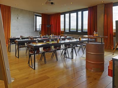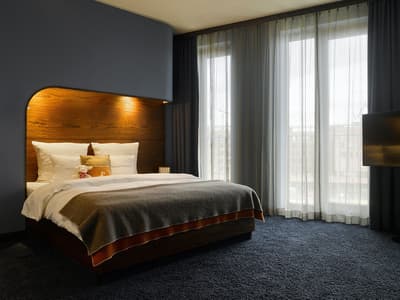Etalée en lettres lumineuses sur la façade, la mention « let’s spend the night together » affiche la couleur ! Au-delà du clin d’œil à la pop culture, le 25hours HafenCity casse les codes traditionnels de l’hôtellerie. Bienvenue dans un lieu créatif, vivant et chaleureux ! A 15 minutes du centre historique, le bâtiment en brique ne détonne pas dans ce quartier d’Hafencity, mélange d’entrepôts anciens et de buildings futuristes. Vous êtes dans la zone portuaire et l’univers maritime est omniprésent. Y compris à l’intérieur de l’établissement. Mais attention, rien de kitsch ni de cliché. Les décorateurs ont travaillé avec un conteur et une scénographe pour élaborer un univers aussi design que décalé. Avec un style récup chic et branché. Ça commence dès l’entrée : piliers en béton, plafonds mis à nu, palettes et containers recyclés. Un combo indus écolo hyper stylé. Au premier étage, vous voici dans l’un des hotspots du quartier. Mi salon décontracté, mi bar animé, le lounge au mobilier dépareillé se plie à toutes vos envies. Bibliothèque, aire de jeux, coin détente. Il y a même des consoles vidéo vintage et une vinyl room avec une méga collection de 33 tours ! Dans le prolongement, le resto propose plats régionaux et produits bio. Grosse ambiance le week-end avec musique live et DJ. L’endroit parfait pour chiller ? Le container sur le toit qui abrite un sauna et une salle de relaxation avec vue panoramique sur le quartier !
