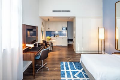 A priori, pas grand-chose à voir entre un 5 étoiles et un centre des impôts… Sauf au Fraser Suites de Hambourg ! L’établissement est installé dans un des buildings emblématiques du centre-ville. Facilement reconnaissable à sa forme ronde et à sa façade en briques, le bâtiment abritait jusqu’à récemment les autorités fiscales locales. Une rénovation minutieuse a conservé bon nombre d’éléments du monument classé. Dès l’arrivée, la sensation de luxe sophistiqué est totale. Le hall d’entrée est juste somptueux avec ses colonnes de marbre et son comptoir de réception aux ondulations dorées. L’escalier principal est majestueux avec sa balustrade d’époque en fer forgé. A l’étage, vous trouvez une succession de petits salons qui mixent boiseries anciennes et mobilier design. Ici un espace de repos, là une cheminée stylée, plus loin une bibliothèque. Partout un mélange élégant de bleus et de gris rehaussé de tapis épais, sièges confortables et laiton doré. Dans l’immense salle ovale du rez-de-chaussée, un paravent aux motifs Art déco sépare le bar du restaurant. Comptoir blanc et corners cosy d’un côté. Tables nappées, buffets extravagants et déco raffinée de l’autre. Tout autour, les vitrines d’origine servent de casiers à bouteilles. Les suites sont équipées de kitchenettes et quelques chambres ont une jolie vue sur le canal. Notre conseil pour transpirer sans passer par la salle de sport ? Les deux saunas finlandais !