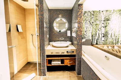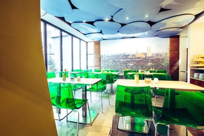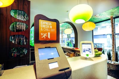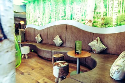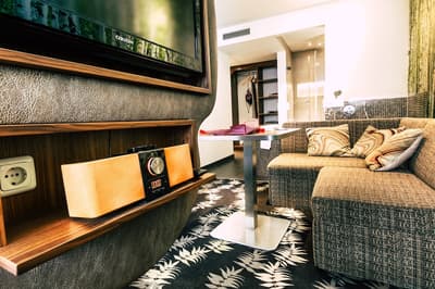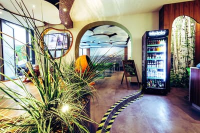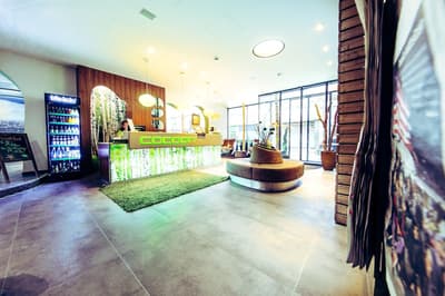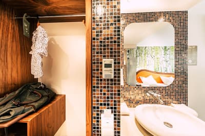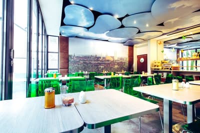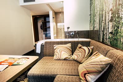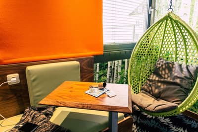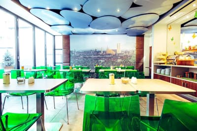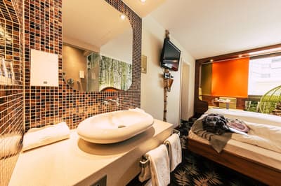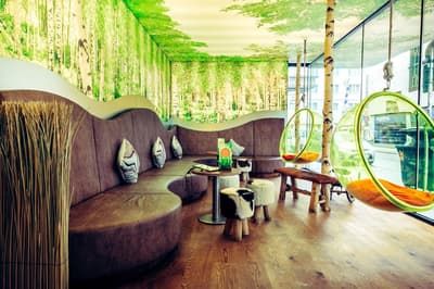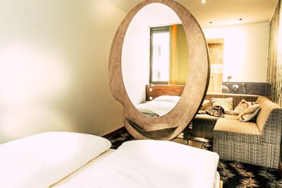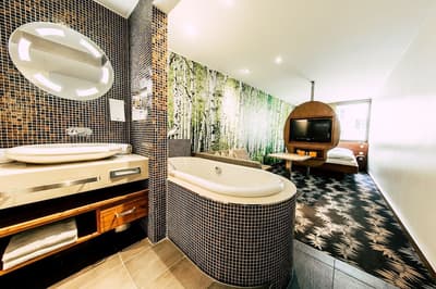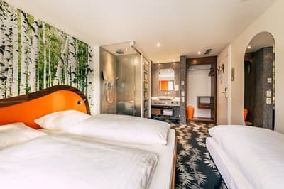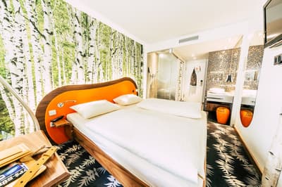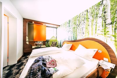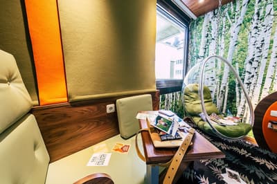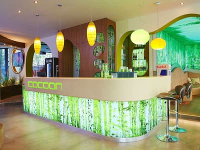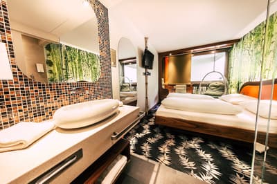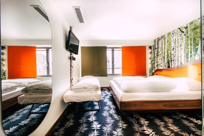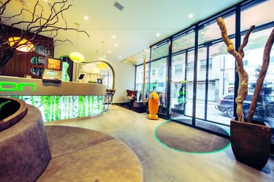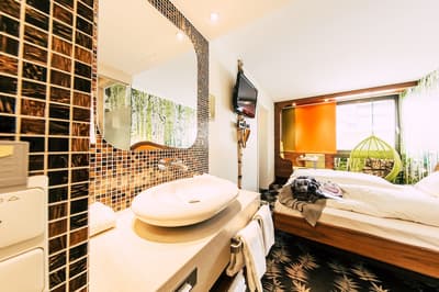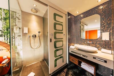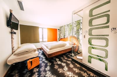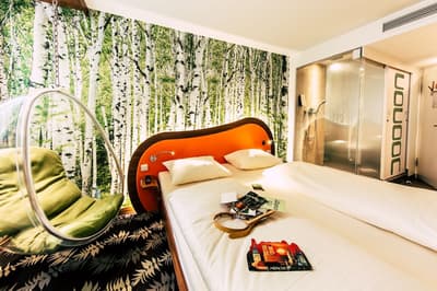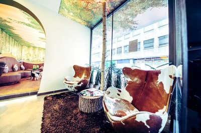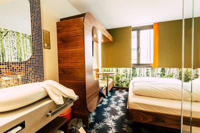 Une oasis de verdure en plein centre de Munich ! Dès votre arrivée à la réception, le ton est donné. Le comptoir est recouvert de motifs végétaux. Lesquels se déclinent un peu partout dans l’hôtel, y compris dans les chambres et les salles de bains. Les sols comme les murs sont recouverts de papier peint ou de moquette rappelant la forêt. Et de nombreuses plantes, dispersées dans tous les espaces, accentuent un peu plus cet effet végétal. La déco est plutôt moderne, elle mixe pièces design et pièces chinées. Et au Cocoon Stachus, le vert flashy est dominant, comme sur les chaises de la salle de restaurant, qui vous accueillera pour le petit déjeuner. Il n’y a pas de resto, mais le lobby-bar lounge, chaleureux et accueillant, est juste idéal pour prendre un verre et chiller tranquille, dans ses grands fauteuils suspendus au plafond, en forme d’œuf. Des fauteuils que vous retrouverez aussi dans votre chambre. Pas très grandes, les chambres, 25 m2 max : c'est plus cocoon, non ? La déco, toujours inspirée de la nature, est tout aussi design et verte, avec des motifs floraux au sol et au mur. Attention, pour les plus pudiques d’entre vous, les salles de bains, équipées de douche à effet pluie, sont ouvertes, et une simple cloison de verre les séparent de l’espace nuit. Vous voilà prévenus !