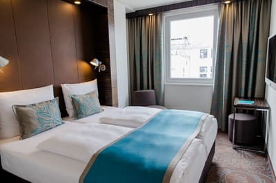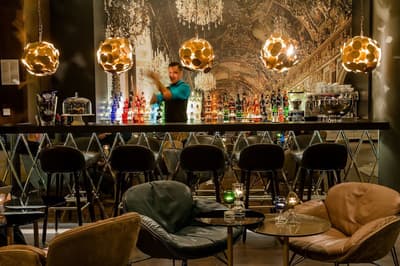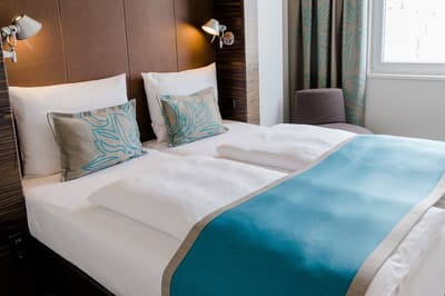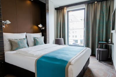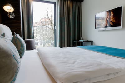Qui dit emplacement royal dit ambiance royale ! Les deux vont forcément de pair. A l’intérieur de la vieille ville de Munich (« Altstadt » pour les intimes), à quelques dizaines de mètres de la place Sendlinger Tor, l’hôtel vous propose de vous prendre pour Beyoncé le temps d’un séjour. Entre ses lustres brillant de mille feux, visibles à dix kilomètres à la ronde, et son ambiance tamisée chaleureuse, le bar-lounge donne envie d’y passer des heures. Asseyez-vous donc dans un de ces fauteuils gigantesques et imaginez que vous êtes Queen Bee. Sans l'ombre d'un doute, c'est vous ! Et puisqu’une bonne nouvelle ne tombe jamais seule, sachez que le bar est ouvert 24 heures sur 24 et sept jours sur sept. Il est si beau que c’est même là que prend le petit-déjeuner (majoritairement bio, s’il vous plaît), ce qui peut quand même créer quelques problèmes de logistique dont on se passerait bien de bon matin. On y retrouve aussi beaucoup de turquoise, couleur inévitable du groupe Motel One, jusque dans les chaises longues sur les balcons, les oreillers dans les chambres (assez petites, certes) et les uniformes des employés. Pas de quoi vous décourager à « put a ring on it », n’est-ce pas ?