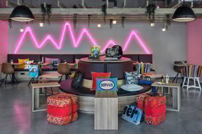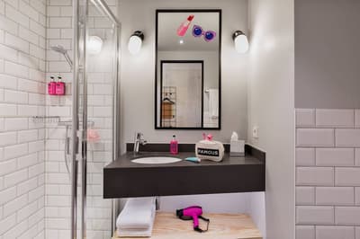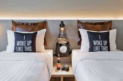 Le mot d’ordre : Play on #atthemoxy ! Cet hôtel récent, construit en 2019, est parfaitement intégré à l’environnement urbain de son quartier de Munich. Résolument design et contemporaine, sa déco ne manque pas d’audace. Le rose fluo, couleur signature du Moxy, s’invite un peu partout, depuis la façade, où le nom de l'établissement s’affiche en néon rose flashy, en passant par le bar et même les accessoires des salles de bains. Et ici, tous les espaces sont ouverts... Accueil, bar (où on vous offre un coktail de bienvenue !), espace cheminée, bibliothèque, table commune de restauration, épicerie ou distributeurs de boissons et de nourriture : tous se confond en une seule et unique zone. Dans ce lobby géant, l’urbain se mixe avec le style industriel : mur de briques, étagères métalliques, objets design, smiley géant et fauteuils en cuir. Côté ambiance, c'est carrément décontracté, ludique et festif. Un baby-foot et des jeux de société en bois vous attendent. Et en soirée, pas question de se poser : le bar se transforme en lieu de fête nocturne ! Quant aux 146 chambres de l’hôtel, elles se déploient sur 5 étages et vous offrent une vue sur la ville. Le style reste le même, citadin et relax, avec du mobilier moderne, en bois, en cuir et en métal. Bref, le point de chute idéal quand on est jeune et dynamique !