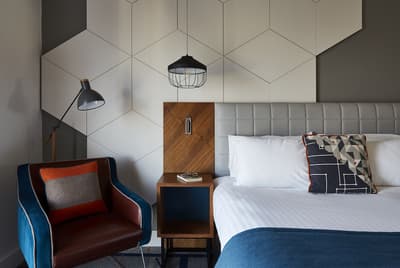 Votre séjour promet d’être aérien, mais aussi, vu la situation, plutôt branché : l’hôtel Indigo Birmingham s’est installé dans les derniers étages du Cube, un immeuble aux allures futuristes emblématique de cette ville d’Angleterre. "The Cube" en anglais — facile à retenir — se dresse au-dessus d’une des rives du canal : un lieu où il fait bon se balader au gré des bâtiments de briques rouges, notamment des anciennes usines, mais aussi des minuscules péniches et des terrasses de pubs géantes. Ça promet ! Votre pied-à-terre est parfait pour prendre de la hauteur sur la ville. Vous pouvez par exemple s’asseoir sur les fauteuils pivotants de style sixties de votre chambre, judicieusement placés près des immenses vitres inclinées. La déco rappelle subtilement la structure, très originale, du building : on retrouve des motifs géométriques partout ! Dans les moquettes colorées, le meuble doré de la réception, les luminaires design à ampoules apparentes, les carreaux de la salle de bain ou le mur de certaines chambres, qui ressemble à un puzzle. Autre élément à bien observer : les miroirs, parfois ronds, parfois découpés, où se reflètent les vues incroyables sur la ville de Birmingham. Sensation de vertige, mais plutôt plaisante, assurée !