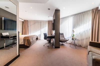 L’ensemble est dans un style contemporain et minimaliste avec un mobilier et des accessoires tendances. La chambre est dotée d’un lit king ou queen et la salle de bains comprend une combinaison douche et baignoire. Le tout dans une ambiance relaxante !