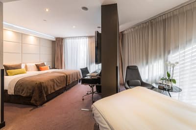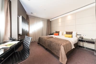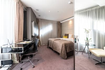 L’ensemble est dans un style contemporain et minimaliste avec un mobilier et des accessoires tendances. La chambre est dotée de lits jumeaux et la salle de bains comprend une combinaison douche et baignoire. Le tout dans une ambiance relaxante !
