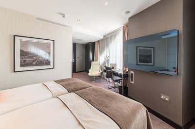 Joliment aménagée, elle offre une vue sur la ville et dispose d’équipements modernes pour un séjour pratique. La chambre est accessible aux personnes à mobilité réduite avec douche accessible en fauteuil roulant.