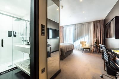 Comme son nom l’indique, le M by Montcalm Tech City est situé en plein cœur de la Silicon Valley londonienne. Entouré de start-ups et d’entreprises high tech, l’hôtel vous attire d’abord par la forme géométrique de son building. Comme un diamant taillé en pointe avec des fenêtres irrégulières qui lui donnent un look de peinture abstraite. Dans le hall, un design hyper moderne, des installations lumineuses stylées et un look un brin futuriste. Le tout réchauffé par des canapés en cuir et un immense bar lounge situé juste à côté de la réception. La technologie est présente dès l’accueil. On vous enregistre sur un iPad. Dans votre chambre, une tablette permet de régler température, éclairages et rideaux sans avoir à bouger de votre lit. Une autre tablette tactile est insérée dans le mur à l’entrée de la salle de bains. Même l’écran de votre télé a des airs d’iPad géant. Attention, vous n’avez pas atterri chez Big Brother ! Vous pouvez aussi faire appel aux services d’un majordome de bain et même d’un sleep concierge qui vous propose menu d’oreillers, boisson chaude ou préparation de lit parfumée à la lavande. Avec ses couleurs sobres et son mobilier profilé, la déco des chambres est à l’image de l’hôtel : sophistiquée et moderne. Un style que vous retrouvez également du côté du spa avec un espace piscine et sauna topissime. Parce que même quand on est geek, rien ne vaut une séance de jacuzzi après avoir crapahuté toute la journée.