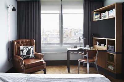 Bienvenue dans le temple du East London cool et branché ! Premier établissement du Groupe Hoxton a avoir ouvert ses portes en 2006, le Shoreditch est devenu l’un des centres névralgiques de ce bouillonnant et très créatif quartier. Et le moins que l’on puisse dire, c’est qu’il attire énormément de monde. L’atmosphère y est hyper conviviale, plutôt esprit co-working dans la journée et carrément festive le soir. L’endroit s’y prête parfaitement. Dès votre arrivée, vous êtes accueilli par un joyeux mélange de style indus et de mobilier vintage. Front desk en tiroirs recyclés, fauteuils en cuir vieilli, murs en briques apparentes, sols en béton poli. Le grand salon commun s’étire en longueur avec des coins cheminées et des montagnes de bouquins. Mais n’espérez pas vous y asseoir pour méditer. Le niveau sonore est plutôt élevé et le lieu plutôt passant. A côté, un bar démesuré et un resto super sympa avec ses banquettes en cuir rouge et son ambiance made in USA. Vous pouvez commander à manger à toute heure de la journée mais si vous voulez vous attabler, on vous conseille vraiment de réserver ! Les chambres sont particulièrement stylées avec leur mix de style urban chic et de touches 50s. Neuf d’entre elles ont été spécialement décorées par des artistes locaux. Si vous aimez dormir à poings fermés, mieux vaut privilégier les étages supérieurs. Mais si vous aimez refaire le monde jusqu’à 2 heures du mat, vous êtes au bon endroit !