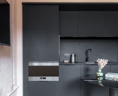 Plaque de cuisson, Réfrigérateur/congélateur et four à micro-ondes, ainsi que de nombreux ustensiles de cuisine design.