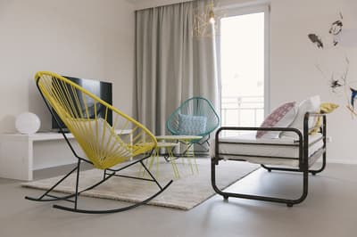 Simple et cosy, c’est un petit cocon. Dominée de blanc, elle est résolument design. Elle laisse pénétrer la lumière naturelle pour une pièce lumineuse et accueillante. Les meubles en bois ajoutent une touche d’exotisme à la décoration.