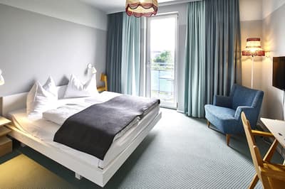 Le balcon profite d’une vue reposante. Cette belle chambre a tout ce qu’il faut pour un séjour agréable et confortable. Elle accommode un grand lit et dispose de beaux fauteuils dans un coin de la pièce. Salle de bain chic.