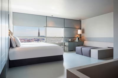On top of the world. Le gratte-ciel est imposant, il domine la ville même. Entre ça et son énorme SO/ sur la façade, une chose est sûre : vous ne passerez pas des heures à le chercher en arrivant. Mais alors, si c’est comme ça d’en bas, comment est-ce en haut, direz-vous ? Et bien, encore mieux ! Inutile de vous soucier de la vue depuis votre chambre, celle-ci sera forcément splendide. Même si votre chambre n'avait pas de fenêtre, il serait impossible d'en louper une miette. Que vous soyez en train de vous relaxer au spa avec son menu de soins et massages (un massage au sel de l’Himalaya s’il-vous-plaît !) ou de vous défouler à la salle de sport, la vue sera encore et toujours là. Mais, ce n’est évidemment rien à côté de la vue panoramique à 360 degrés du bar-restaurant au 18ème étage. Avec la multitude de couleurs sur son plafond, les couchers de soleil y sont sublimés. Vous hésitez encore ? SO/ Vienna est un dérivé de la chaîne française Sofitel. Une valeur sûre rappelant la maison ! En plus, le bâtiment a été construit par Jean Nouvel, un architecte français. Les vacances de luxe mais comme à la maison.