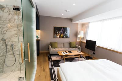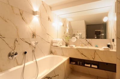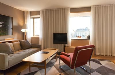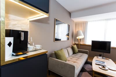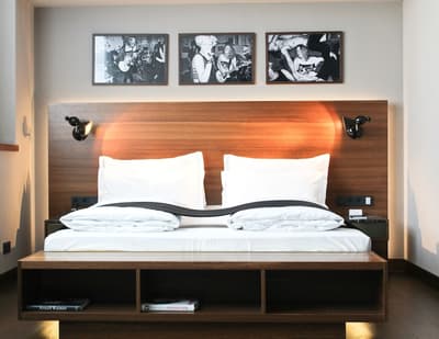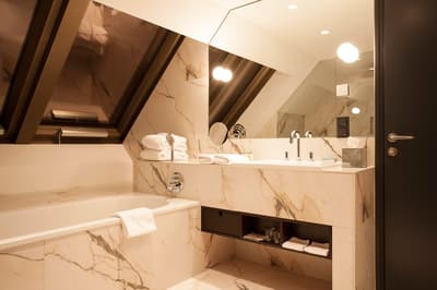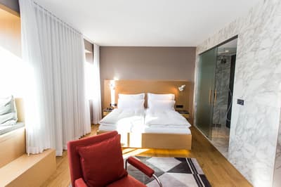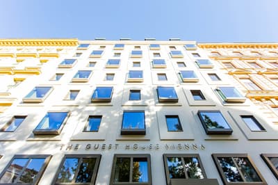 Une ancienne auberge de jeunesse des années 50 transformée en hôtel 5 étoiles. Du coup, pas de spa, ni de salle de sport ou piscine, et un tout petit lobby… et puis, pourquoi faire ? Vous n’en aurez pas besoin tellement vous serez occupés à visiter la ville ! Mais, en rentrant, vous aurez tout le confort nécessaire. De l’extérieur, vous verrez des fenêtres en cubes qui sortent du bâtiment. Ce qui pourrait uniquement être du design –en plus d’être un boutique-hôtel, c’est un design hotel, rappelons-le- est en fait bien plus. De l’intérieur, ces fenêtres sont des petits coins aménagés et douillets pour lire ou faire tout autre chose. Matelas, coussins et lampe : vous aurez la totale pour vous mettre à l’aise. Avec vue sur la ville, évidemment ! Quoi de plus ? Un mini-bar à volonté dans toutes les chambres. Et pas qu’avec deux bouteilles de sodas qui se battent en duel, non ! Des bouteilles d’eau, des softs et surtout… deux bouteilles de vin blanc et deux bouteilles de vin rouge. Vous pouvez même les apporter au restaurant en allant dîner. On ne se moque pas de vous, n’est-ce pas ? "My residence in Vienna is The Guesthouse" est écrit sur les cartes de visite – en repartant, vous serez d’accord !