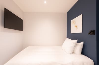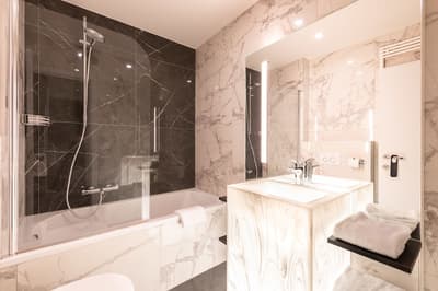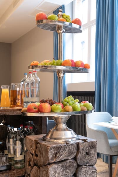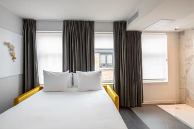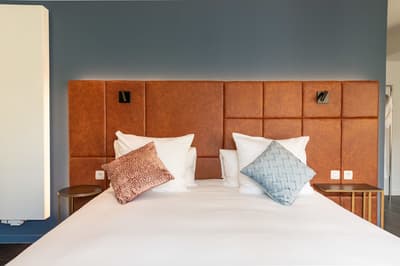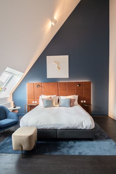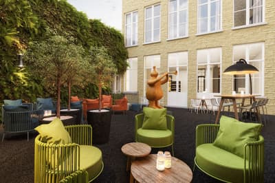 Vous aimez les lieux chargés d’histoire ? Vous allez être servi ! Le Sablon est carrément le plus ancien hôtel de Bruges ! Il a bien sûr été rénové de la tête aux pieds mais la dimension historique reste perceptible à votre arrivée. Regardez la façade en briques du 16ème siècle et le porche voûté qui sert d’entrée. De l’autre côté, vous débouchez sur un ravissant patio végétalisé. Comme un petit jardin intérieur agrémenté de mobilier aux couleurs flashy et de sculptures modernes. Vous n’êtes pas au bout de vos surprises ! Le bâtiment ancien joue la carte du design contemporain, mélangeant clins d’œil au passé et originalité. Pas de front desk traditionnel. L’accueil se fait dans un salon à l’esthétique raffinée. Sol en marbre, fauteuils profonds, luminaires high tech et œuvres d’art décalées. Dans le prolongement, le bar habillé de noir avec tout au fond, une magnifique cheminée ancienne. Les grandes portes-fenêtres s’ouvrent sur la fraîcheur du patio. L’hôtel n’a pas de restaurant mais le petit déjeuner ressemble davantage à un brunch ! D’immenses buffets sont disposés dans une salle spacieuse et joliment décorée. Sièges profilés aux teintes pastel, luminaires stylés et tout au fond, une belle cheminée à foyer ouvert. Une ambiance de luxe intemporel que vous retrouvez dans les chambres. Big plus : vous êtes à trois minutes à pied du centre ! Et si vous voulez sillonner la ville, l’hôtel vous prête même des vélos !