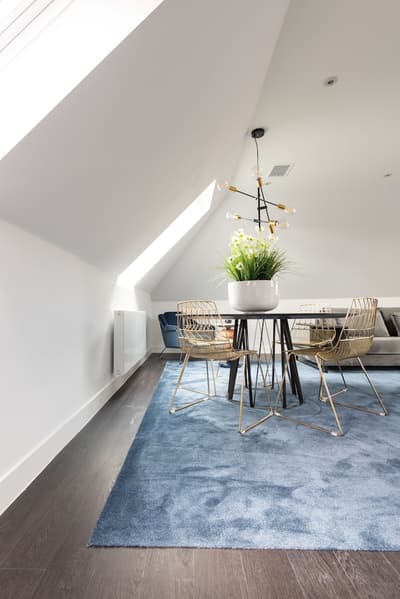 Peinte de tons neutres, elle est d’un style résolument design. Elle laisse pénétrer la lumière naturelle pour une pièce lumineuse et accueillante. Le mélange de bois, de métal et de verre rend l’ensemble élégant. Quelques touches de couleurs vives lui donnent du peps.