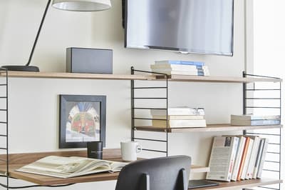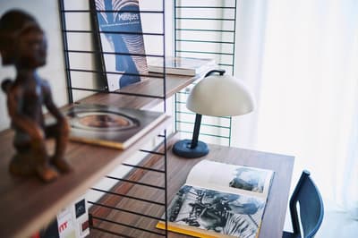 Dominée de blanc, elle est résolument design. Elle laisse pénétrer la lumière naturelle pour une pièce lumineuse et accueillante. Le mélange de bois, de métal et de verre rend l’ensemble élégant. Quelques touches de couleurs vives lui donnent du peps.