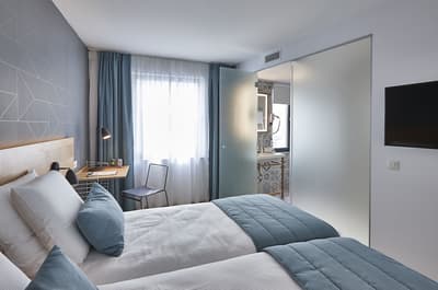 Dans une décoration contemporaine, elle est dotée d’un parquet en bois clair, d’accessoires et de mobiliers tendances et se complète dans une dominance de blanc. Elle peut être dotée d’un lit simple, twin ou king size et la salle de bains est équipée d’une douche ou d’une baignoire. Ambiance cosy !
