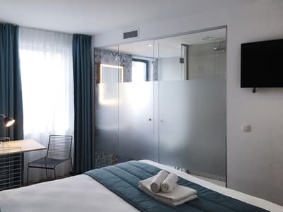 Bureau et chaise de travail, Garde-robe, Coffre-fort, Chauffage, Non-fumeur, Table et fer à repasser (sur demande), Médias et technologie, Ultra-rapide et Wi-Fi gratuit, TV à écran plat, Internet fibre optique et qualité TV, 75 chaînes internationales, Téléphone, Équipements de la salle de bains, Toilettes gratuits, Sèche-cheveux.