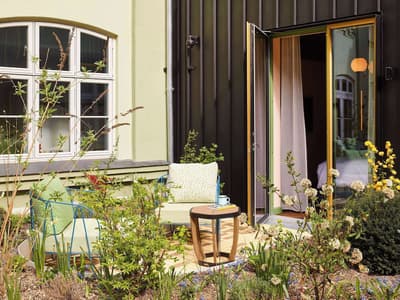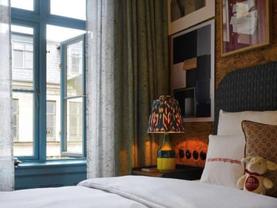 Retour sur les bancs de la fac ! On vous a épargné le pire et la vague boutonneuse du lycée, remerciez-nous. Cet hôtel est effectivement situé dans quatre bâtiments du XIXe siècle, une ancienne usine de porcelaine transformée en université elle-même transformée en ce fameux 25hours. Le premier établissement du groupe en Scandinavie, mais sûrement pas le dernier, tellement ce groupe allemand vient imposer sa vision du monde à toute l’Europe. L’hôtel est tellement neuf que vous devriez encore sentir la peinture toute fraîche, ou presque. Comme à chaque fois, le design s’inspire de l’histoire du bâtiment. Ici, c’est donc ambiance fac avec des notes scientifiques aux murs de certaines chambres. Pas de panique si vous n’y comprenez rien en y jetant un bref coup d’œil pas si intéressé : nous aussi, on était au dernier rang des cours de physique-chimie. Et on s’en est pas si mal sortis, n’est-ce pas ? Les clins d’œil historiques ne s’arrêtent pas là : que vous les reconnaissiez ou non, ils sont partout. Bibliothèque, hall ou salle à vinyles, car la musique est essentielle aux révisions ! Et si vous êtes là pour vous éclater plutôt que pour bachoter, vous serez également servis : avec ses fauteuils et ses plantes abondantes, le lobby-bar baigné par le soleil est THE place to be.