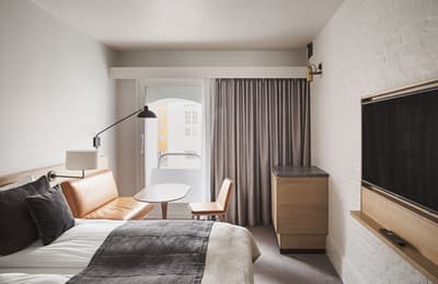 Avec vue sur l'Opéra et le Palais royal à tribord, et le centre ville de Copenhague à bâbord, le Copenhagen Admiral Hotel est un fleuron du paysage architectural danois. Il se démarque du fait de son imposante façade grise surmontée de tourelles caractéristiques des entrepôts du XVIIe siècle. Transformé avec élégance, ses éléments structurels sont devenus ses meilleurs atouts pour créer une ambiance chaleureuse et authentique. Murs en briques crues, grandes arches et demi-lune et poutres en pin de Poméranie vieilles de 200 ans, l'ancien grenier à blé est maintenant un bâtiment primé, qui comprend également un restaurant-bar conçu par Conran, - SALT. 366 chambres et autant d'expériences uniques, car elles ont toutes été agencées individuellement, en étroite collaboration avec un groupe d'architectes d'intérieur danois, afin de conserver ce parfum d'histoire intrinsèque à leur charme. Ce côté cabine de bateau, elle le doivent au mobilier personnalisé de Skagerak (anciennement Trip Trap).
