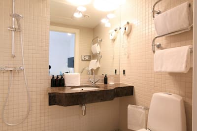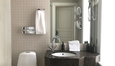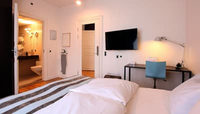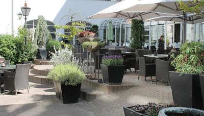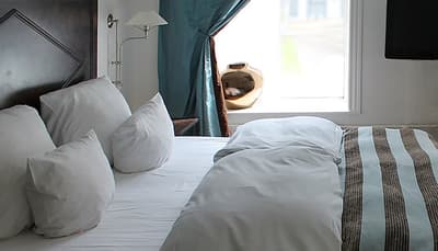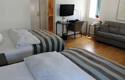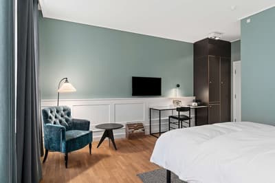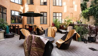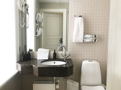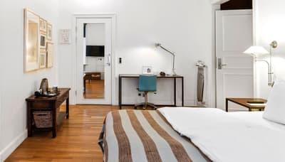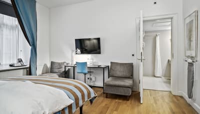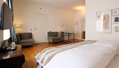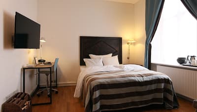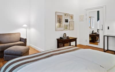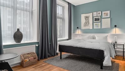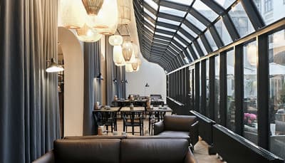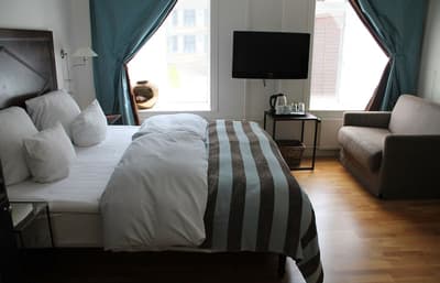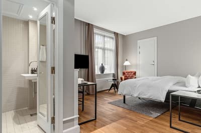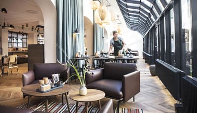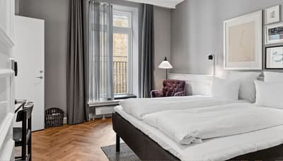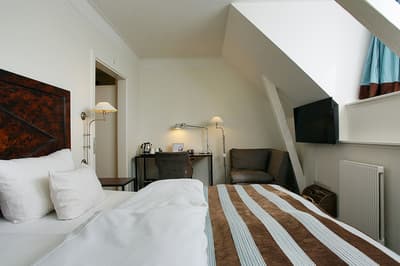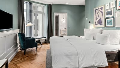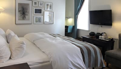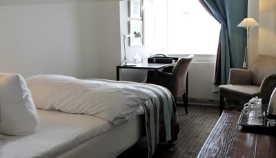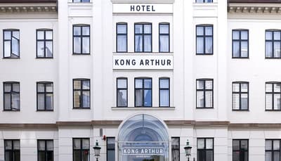 Comment ne pas se laisser charmer par cette vénérable façade blanche, nichée au fond d'une impasse pavée, en retrait de la route qui borde les lacs de Copenhague ? À la fois imbriquée dans la ville, et proche de l'eau, à la fois en retrait et proche des rues les plus animées. Au bord de la magnifique enfilade de cinq lacs rectangulaires, --les anciennes douves de la ville, l'Hôtel Kong Arthur recèle de trésors cachés. Son nom « Roi Arthur » lui donne un petit cachet légendaire, les écussons des manteaux de cheminée et les armures médiévales étincelantes vous le rappelleront. Selfie s'impose. Attendez-vous à un escalier d'époque, de beaux parquets en chêne, d'immense canapés en velours damassé, et de lourds rideaux amidonnés. La cour intérieure et sa verrière apportent une touche de verdure reposante et surtout une belle lumière, en été comme en hiver. Superbe hôtel de caractère, si la décoration reste sobre et classique, dans des teintes de turquoise et de brun, c'est dans les détails qu'ils se démarque, et surtout son atmosphère propice à la détente. Proche de tout, vous pourrez rapidement vous y réfugier près du feu après de longues balade dans Copenhague.