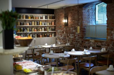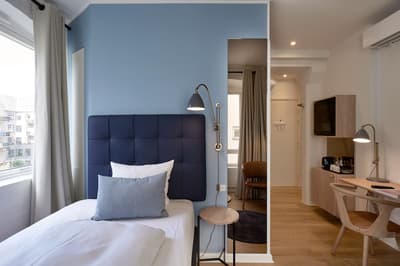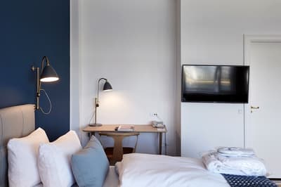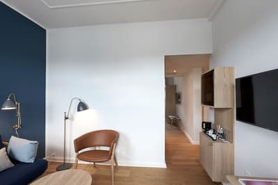 Luxe subtil et une lumière nordique au rendez-vous, dans cet ancien entrepôt du front de mer, datant de 1869. Les marchandises ont laissé places à 174 chambres tout en camaïeu de bleu et gris, et design scandinave. La déco inspirée par l’emplacement naturel de l’hôtel, joue avec l'eau et la lumière changeante, mariant entre elles les matières nobles des textiles et du mobilier : cuir brun, bois clair, velours bleus. Le tout exhale une ambiance chaleureuse et tellement « hygge ». Vous y serez accueillis sous le niveau de la mer, ou est aussi servi le petit-déjeuner dans une salle aux briques nues et mobilier danois du milieu du XXe siècle. Les chaises CH33 de Hans Wegner n'ont pas pris une ride depuis 1957. De même pour les classiques « Wishbone » de Carl Hansen & Søn, que vous retrouverez une fois gagné le confort feutré de vos chambres. Si la sélection standard est un peu étriquée, vous pouvez toujours demander un transat à l’accueil, et faire des quais votre salon d'appoint. Série de trampoline supplément ! Que demander de plus...un petit cocktail ?