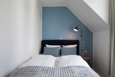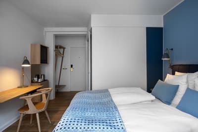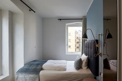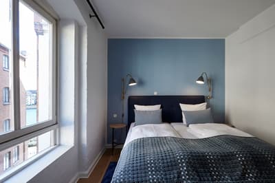 Posées au bord du canal, les chambres au style scandinave à souhait, allient tons bleus, et bois clair, le tout baignant dans cette lumière nordique si particulière et reposante.