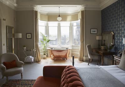 Ça vous dit un séjour authentiquement écossais dans un manoir raffiné ? Alors posez vos valises aux Dunstane Houses ! Cet établissement 5 étoiles est situé dans une très chic banlieue résidentielle d’Edimbourg, à quelques minutes du centre. Il regroupe deux maisons victoriennes qui se font face. Récemment rénovées, elles allient d’élégantes caractéristiques d’origine à un design soigné. Vous êtes accueilli comme si vous étiez un ami de la maison. Dès l’entrée, le ton est donné. Le hall est tapissé de boiseries. Un joli vitrail éclaire la cage d’escalier. Sur les murs, des photos témoignent du goût des propriétaires pour les voitures de collection. Les sols sont recouvert de tapis orientaux. Une atmosphère de luxe cosy se dégage des parties communes. Notamment au Ba ‘Bar & Lounge. Côté bar, murs bleu nuit et fauteuils en velours encadrent une impressionnante collection de whiskies et de gins. Côté lounge, vous pouvez grignoter toute la journée dans de confortables canapés chesterfield. En fonction du temps, vous pouvez aussi vous installer dans le jardin aménagé. Dans les chambres, les couleurs chaudes des papiers peints s’harmonisent avec les motifs écossais des coussins. Certaines ont des têtes de lit capitonnées, d’autres, des baldaquins modernes. Des miroirs au cadre doré et quelques meubles anciens voisinent avec un téléphone et une radio au look rétro. Mais rassurez-vous, le Wi-Fi fonctionne très bien !