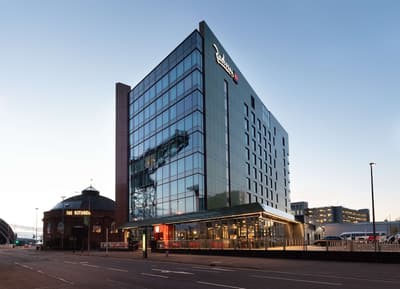 Si vous aimez les bars rooftop et les vues panoramiques, ne cherchez pas plus loin ! Le Radisson RED est pour vous ! Ce bâtiment moderne de 8 étages n’est pas pile en centre-ville mais il est dans une zone animée au bord du fleuve Clyde. D’où le superbe point de vue dégagé. Si en plus vous appréciez la déco moderne et funky, vous allez être servi ! Le hall est ultra design avec son mur d’images et ses tabourets hexagonaux. Sols bruts et plafonds mis à nu ajoutent un côté indus. Pour faire votre check-in, des écrans sont à disposition. Une drôle de cloison alvéolée façon ruche délimite l’entrée dans l’espace du OUIBar + KTCHN. Côté bar, la tendance est ultra graphique : sol noir et blanc, sièges rouges profilés et murs couverts de fresques dessinées. Luminaires argentés façon projecteur. Côté resto, banquettes rouge vif, table de snooker et ambiance décontractée. Vous en voulez plus ? Direction le Red Sky Bar, le seul bar sur le toit de Glasgow. Très élégant avec son comptoir tout en longueur, ses espaces salons et ses murs marbrés. Topissime pour siroter un cocktail en regardant le soleil se coucher derrière les immenses baies vitrées ! Pour instagrammers acharnés, il y a même une petite terrasse extérieure ! Vous retrouvez l’ambiance design arty dans les chambres. Sur les murs, des fresques unicolores mélangent façades de Glasgow et personnages de bandes dessinées. A travers les immenses fenêtres, la vue est à tomber !